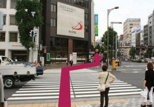 ③交差点の反対側にあるサンパウロの看板が見えます。歩道を渡りすぐに右に曲がります。