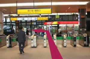 電車から降りて改札が2つありますので、まず改札口を確認してください。