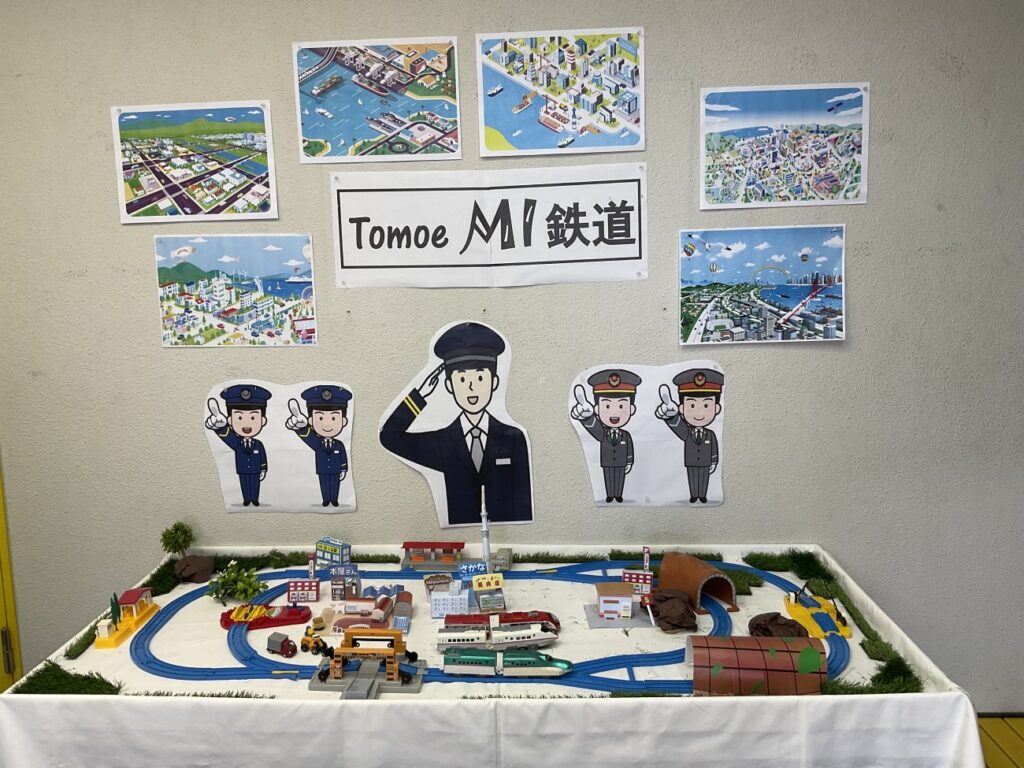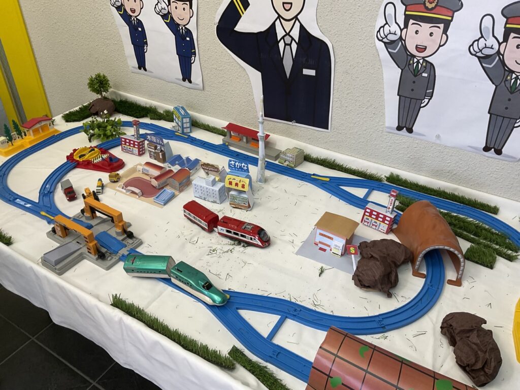2学期が始まり、お教室の玄関は街をはしる鉄道模型に様変わりしました。