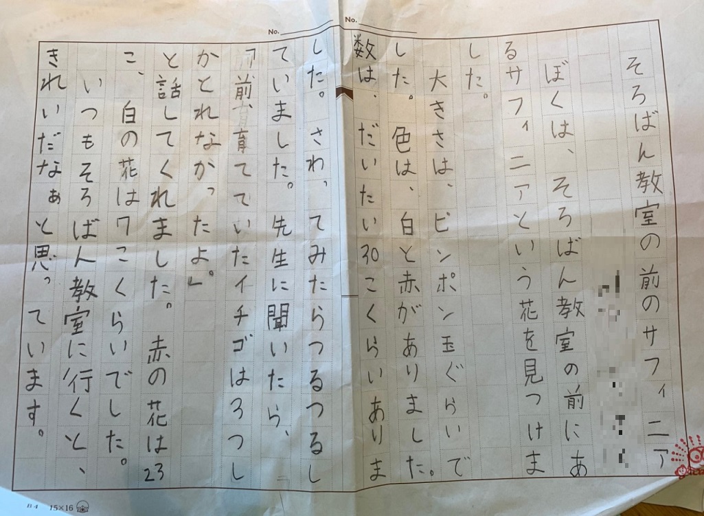 ある2年生の生徒さんはレッスン時に目にするこのお花たちを題材に学校の作文に書いてくれました。6月頃に咲いていたサフィニアの花の数や大きさをよく観察して表現されていて素直な感性が伝わってきます。
