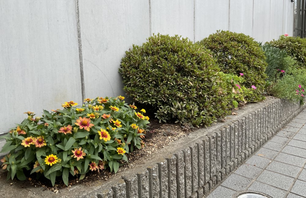 空梅雨だった東京、照りつける強い日射しに耐えているのは人間だけでなく花壇の花も同じでしょう。教室の玄関脇に植えているお花も暑さに負けずガンバっています。